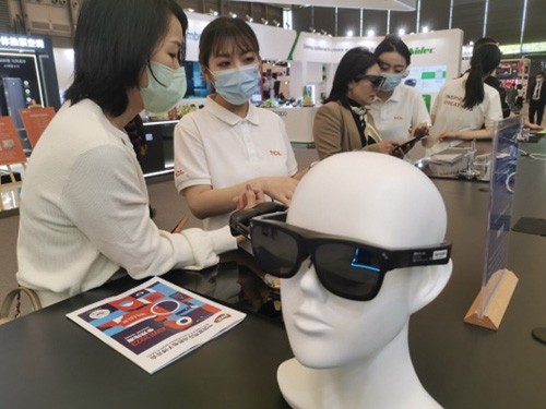在TCL雷鸟展台,一款名为Air 1S的XR眼镜带来智能眼镜在不同场景下的多样应用,吸引了众多观众驻足体验。工作人员告诉记者,这款眼镜采用BirdBath加MicroOLED的技术方案,可为使用者提供130英寸高清巨幕沉浸观感,在使用场景上,这款眼镜可以与手机、平板、Switch、笔记本电脑等设备连接,可以随身携带,使用场景十分丰富。