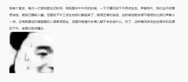 我有个室友,每次一打游戏就忘记时间,特别是中午午休的时候,一下子要玩到下午两点左右,声音特大。我们也不好意思说他,就自己强制入睡。但是到下午三点左右我们都起来了,就很正常的说话,这时候他就会很不耐烦的让我们声音小一点。还有就是他对寝室里的人语言很恶劣,但是对楼道外吵得人都不会去说什么。对了,这种情况多发生在周末和没课的下午。老哥们给点建议~