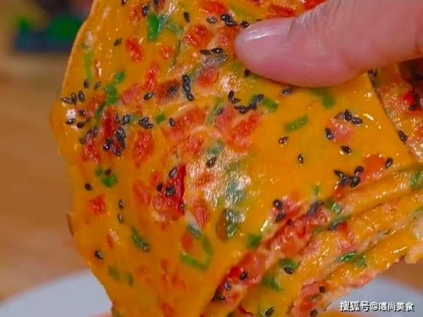 2、平底锅刷油,倒入面糊,均匀的摊平,撒入黑芝麻,小火煎至两面金黄即可。
