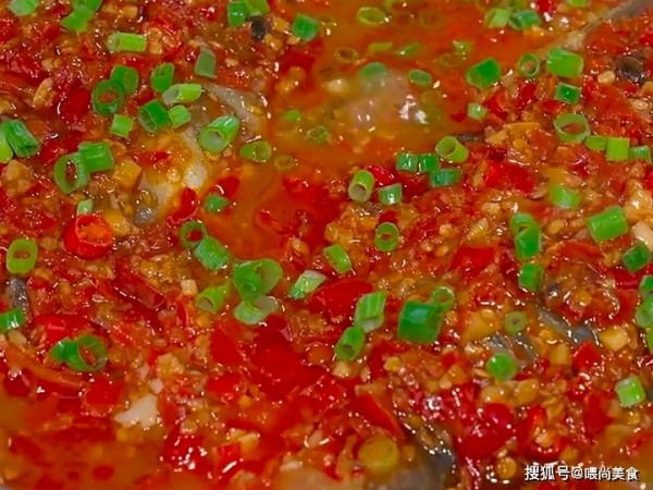 1、鱼头处理干净,再将鱼肉厚的地方改上花刀,剁椒用清水冲洗一下,降低剁椒本身的咸味,再放入葱段、姜片、蒜末,淋入热油激发出香味。