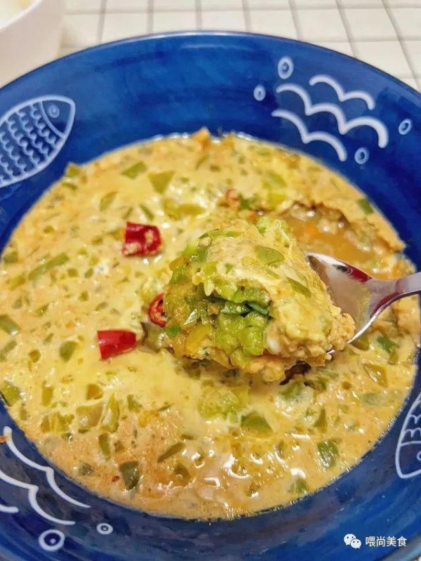 1、清洗干净的辣椒切碎,选择辣味重的辣椒更好吃,碗中打入三个鸡蛋,放入一勺黄豆酱,半勺味精,搅拌均匀。