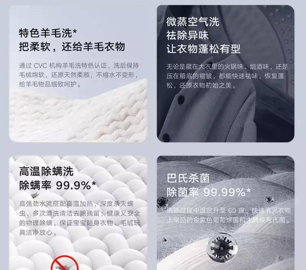 另外它还拥有特色羊毛洗模式,它通过CVC机构羊毛洗特色认证,洗后可以保持毛绒绵软,还原羊毛的天然柔顺,不缩水不变形,给羊毛物品带来精心的呵护。