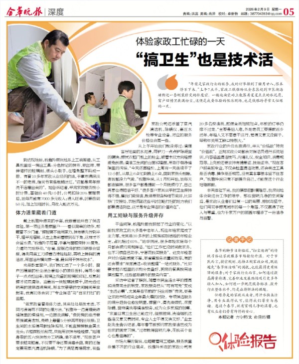 半天体验下来,我的腰早已酸痛难忍,我深刻地体会到这份工作的艰辛。那些窗明几净的空间背后,是家政从业者们日复一日的弯腰、擦拭与坚守。他们用双手擦亮城市的每一个角落,不仅赢得了收入与尊重,也为千家万户的团圆年增添了一份洁净与温馨。