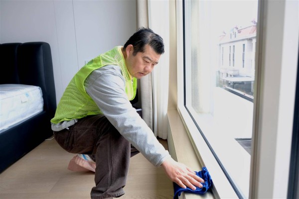 体力活里藏着门道戴上钱雅玲递来的手套,我跟着她开启了保洁体验,第一项任务是擦窗户——看似简单的动作,却藏着不少门道。“擦玻璃不能用蛮力,抹布要先拧到半干,理平无褶皱,从左上角斜着擦到右下角,这样才不会留水渍。”钱雅玲示范着,手掌与窗框保持30度角,力道均匀地移动,“你看,窗框边缘的胶印硬擦会留痕,得先用美工刀顺着边缘轻轻刮,再喷上稀释的清洁液,用百洁布横向擦一遍,最后用干抹布收水”。