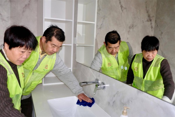 从上午开始我们就没停过:清理客厅地面的水泥渍,用铲刀一点点铲除凝固的硬块;擦拭衣柜门板上的粉尘,顺着木纹方向轻擦避免刮痕;清洁卫生间的台面和墙面,用刷子刷净缝隙里的污垢。“今天还算轻松,上周有一天连续干了12小时,从早上6点忙到晚上6点,回到家倒头就睡,连饭都没力气做。”钱雅玲说,从1月初开始,她每天都连轴转,很多客户都是提前一个月就预约了,自己再累也得把活干好。“很多客户家其实平时卫生保持得不错,雇我们做保洁,就是要把各种细节做好,比如移门交接处、衣柜顶部这些平时忽略打扫的地方我们都要清洁到位,这才是专业保洁的价值所在”。
