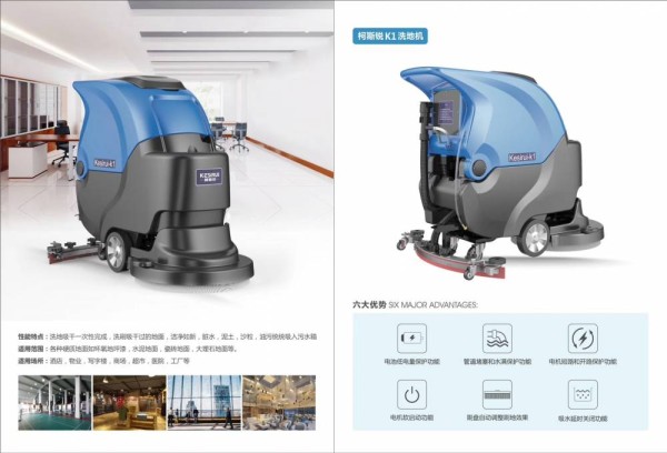 洗擦、吸干一次性完成,洗刷吸干过的地面,洁净如新,脏水、泥土、沙粒、油污统统吸入污水箱;可清洁不同的材质地面,如:环氧树脂地面,油漆地面,混凝土,瓷砖地面等。