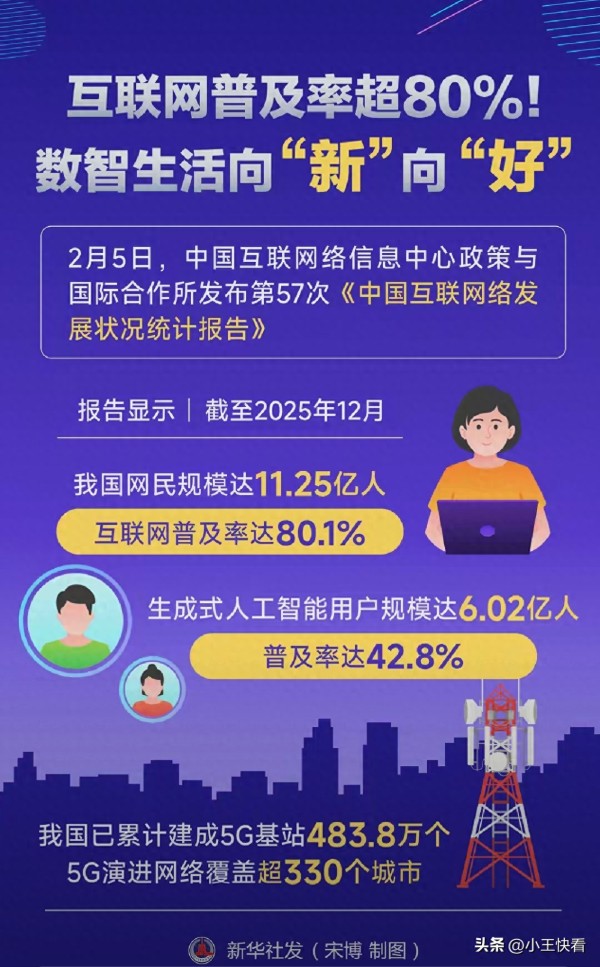 根据中国互联网络信息中心(CNNIC)2026年2月5日发布的第57次《中国互联网络发展状况统计报告》,截至2025年12月,我国网民规模已达到11.25亿,互联网普及率正式突破80%,定格在80.1%。这意味着,每五个中国人中就有四个是网民,数字技术已从曾经的“奢侈品”变成了如今的“生活必需品”。与此同时,生成式人工智能用户规模飙升至6.02亿,普及率42.8%;5G基站累计建成483.8万个,覆盖所有乡镇和95%以上的行政村;智能算力达到1590EFLOPS,位居全球前列——这一串串沉甸甸的数据,不是冰冷的数字符号,而是你我每天都在亲历的“数字日常”,是亿万国人共同书写的数智化篇章。