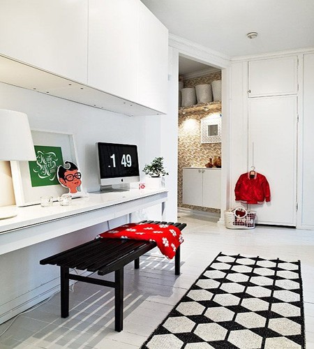 在壁柜的装饰下一张白色的条形桌子靠墙摆放着,远看还以为是挂在墙上的搁架,新颖的视觉感受让书房充满乐趣,镂空的条形凳,放上红色的坐垫感染着小书桌,小书桌上充满艺术气息的物品彰显着主人的气质。