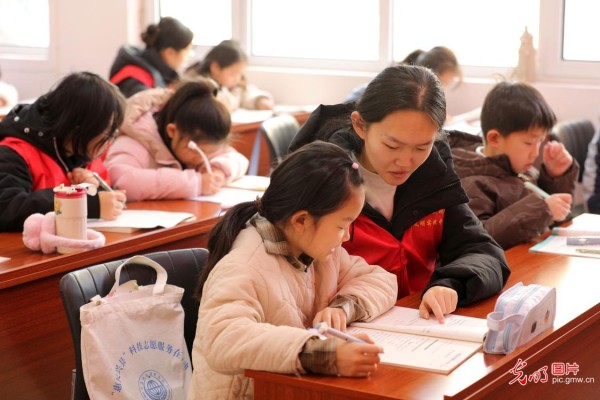 寒假中,河北省邢台市广宗县迎宾社区依托新时代文明实践阵地开设公益托管课堂,由返乡大学生与社区志愿者组成服务团队,为留守儿童、双职工家庭等群体提供涵盖作业辅导、阅读拓展、手工制作、趣味游戏及安全教育等课程的短期托管与教育服务,助力孩子们快乐过寒假。图为大学生志愿者在辅导孩子写寒假作业。(王垒摄/光明图片)