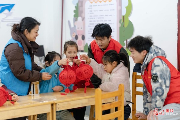 日前,共青团江西省吉安市吉州区委、吉州区青学联组织返家乡大学生志愿者前往吉州区长塘镇长岭社区童心港湾,开展“巧手做灯笼童趣迎新春”活动。大学生志愿者和孩子们一起制作灯笼,在动手实践中感受传统文化魅力。图为孩子们在大学生志愿者的指导下制作灯笼。(李昊龙摄/光明图片)