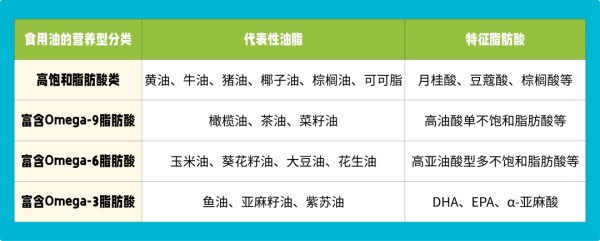 根据《中国居民膳食指南(2022)》的建议,常见的食用油根据其脂肪酸的特性,可分为“高饱和脂肪酸”“富含Omega-9脂肪酸”“富含Omega-6脂肪酸”“富含Omega-3脂肪酸”几种。