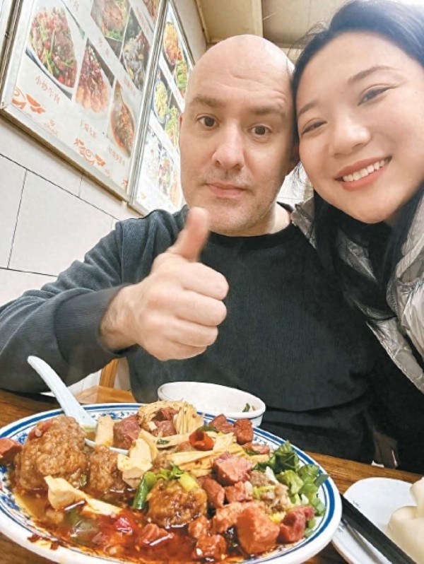 大面是土生土长的英国人,从最初对中式面食的陌生好奇,到如今熟练地揉面、掰馍、泼辣子,甚至能流利说出“美得很”“嫽扎咧”,被网友笑称为“被陕味彻底征服的英国女婿”。