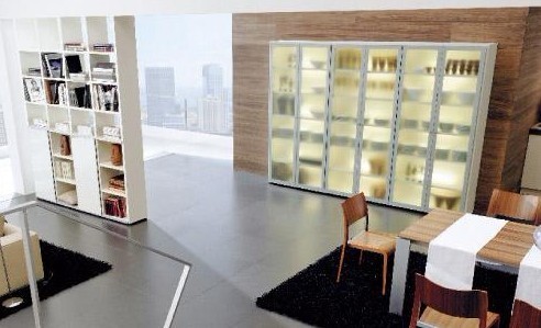 ·搁架的支撑和隔板部分,最好是金属和玻璃材质,这样,两个区域的灯打开时,灯光都能反射在搁架上,显得玲珑剔透。玻璃隔板透光率好,还能反射出户外的景色,令隔断既起到功能作用又不会制造拥堵感。