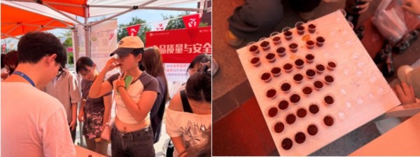 “可乐三点找茬”环节极具创意,老师们准备了三款成分略有差异的可乐,新同学们通过品尝分辨口感、甜度的不同;“四大香型白酒辨香大挑战”同样吸引众多新生参与,清香、浓香、酱香、米香四种香型的白酒整齐摆放,同学们凑近酒杯轻嗅,在专业教师的指导下学习辨别不同香型的特点,深入了解食品风味分析的专业知识;“农残检测初体验”环节最具科普意义,同学们在教师的示范下,尝试使用简易检测设备对蔬菜样本进行农残检测,亲身感受食品质量安全检测的流程与重要性,进一步树立食品安全意识。