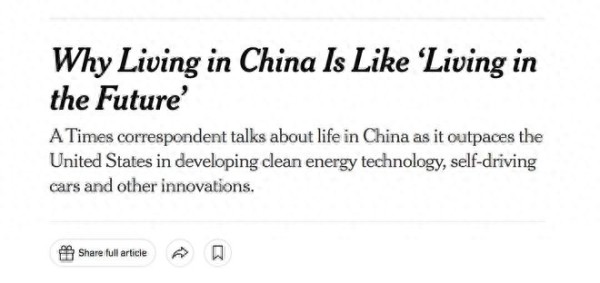 【环球网财经综合报道】近日,《纽约时报》记者刊发系列观察文章,聚焦中国在清洁能源、自动驾驶等创新领域的发展成果,认为中国相关产业实现快速发展并重塑全球产业格局,常驻北京的记者更直言,在中国生活如同“生活在未来”。