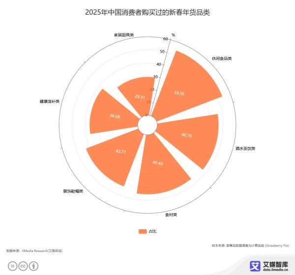 iiMedia Research(艾媒咨询)发布的《2026年中国新春年货消费行为调研数据》显示,在2025年中国消费者购买过的新春年货品类中,休闲食品类占比53.55%,位列第一。紧随其后的是酒水茶饮类和食材类,分别占比46.70%和45.43%。此外,服饰鞋帽类(42.77%)、健康滋补类(36.68%)以及家居厨具类(29.31%)也占有相当比例,表明年货消费正从传统食品向更广泛的品质生活领域延伸。