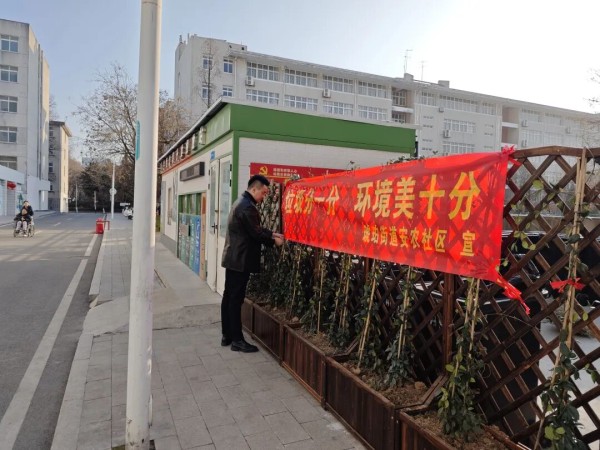 琥珀街道则采取悬挂横幅的方式进行垃圾分类知识宣传,同时对垃圾投放点环境卫生进行清理。醒目的宣传横幅悬挂在小区入口、广场周边等人员密集区域,“垃圾分一分,环境美十分”等标语让过往居民一目了然。