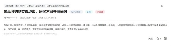 人民網蘭州3月28日電 (記者黃帆)近日,甘肅省嘉峪關市的網友在領導留言板反映急難愁盼問題:“白馬公寓小區旁邊有一個廢品收購站,基本每天都要焚燒垃圾,收購站與居民樓隻有一牆之隔,與幼兒園隻隔著一條馬路,小區居民開窗通風時焚燒煙霧就會彌漫到整個房間裡來,夏天開窗睡覺總被嗆醒。”