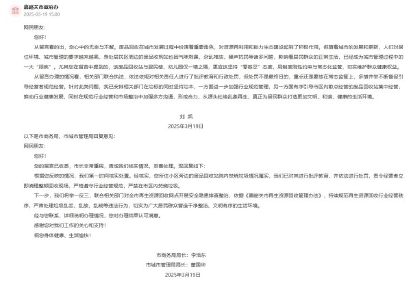 針對該留言,嘉峪關市委副書記、市長劉凱也作出回復:“廢品回收在城市發展過程中扮演著重要角色,對資源再利用和助力生態建設起到了積極作用。但隨著城市的發展和更新,人們對居住環境、城市管理的要求越來越高,身處居民區周邊的廢品收購站也因氣味刺鼻、雜亂堆放、噪聲擾民等諸多問題,影響著居民群眾的正常生活,已經成為城市管理過程中的一大‘頑疾’。尤其您在留言中提到的,該廢品回收站與居民樓、幼兒園僅一牆之隔,更應該堅持‘零容忍’態度,用制度剛性約束與常態化監管,切實維護群眾健康權益。從留言辦理的情況看,相關部門聯合執法,依法依規對相關責任人進行了批評教育和行政處罰,但處罰不是最終目的,重點還是要放在常態監管上,多措並舉不斷督促引導經營者規范經營。針對此類問題,相關部門在治標的同時堅持治本,一方面進一步加強行業規范管理,另一方面有序引導市區內散點經營的廢品回收站集中經營,推動行業健康發展,同時在規范行業經營和市場整治中加強多方溝通,形成合力,從源頭杜絕亂象再生,真正為居民群眾打造更加文明、和諧、健康的生活環境。”