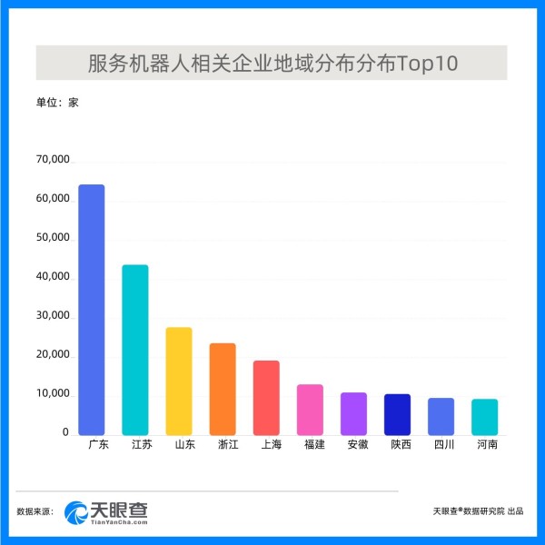 中国拥有最完备的产业目录和最好的供应链网络。在这个连接全球的时代,供应链已成为全球产业发展的核心。中国作为世界第一制造大国,拥有世界上最完整的产业目录,加上中国深耕多年的基础设施建设,中国拥有最好的供应链网络,造就了全球最具性价比的市场,使得任何智能硬件产品的成本降低成为可能。天眼查数据显示,服务机器人相关企业地域分布中,广东、江苏、山东三地企业数量排名前三,其中广东企业数量超6万家,位列第一。