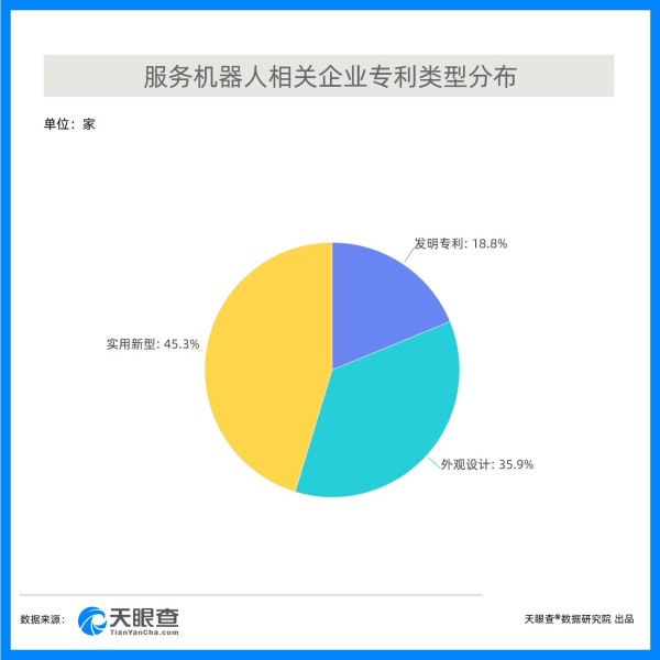 创新驱动产业快速发展。对于服务机器人这类产品而言,除了宣传、人力等相对的隐性成本外,电池技术、原材料等显性成本是制约了这类产品发展,特别是大规模商业化的重要障碍。创新战略的实施驱动产业技术,从材料、芯片的研发、以至到室内定位技术迭代,电池续航能力等方面都取得了长足进步,用户体验感得到极大提升。天眼查数据显示,服务机器人相关专利中(有效专利),实用新型占比第一,外观设计位列第二,发明专利第三。