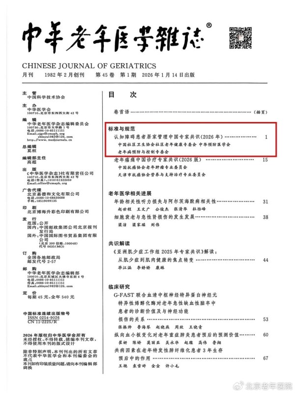 近日,由北京老年医院院长禹震、认知障碍诊疗中心主任吕继辉牵头,联合全国数十位老年医学、神经病学、精神病学、全科医学、康复医学及中医学等多学科权威专家共同编撰的《认知障碍患者居家管理中国专家共识(2026)》,在《中华老年医学杂志》2026年首期头条重磅刊出。这一国家级共识的发布,填补了我国认知障碍患者居家管理普适性规范的空白,为破解人口老龄化背景下的“居家照护难”问题提供了科学系统的解决方案。