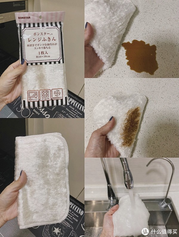 吸水性强,而且不沾油。用来厨房台面上的汤汤汁汁,立即用水冲,可以做到立马干净。