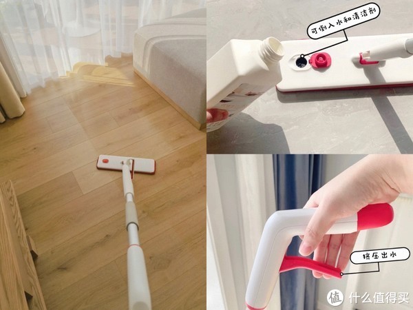 可选这种带喷水功能的平板拖把,可满足偶尔的手动湿拖需求,并且这个拖把设计细节很多,可刮水,自动磁吸回弹等等特性都有。