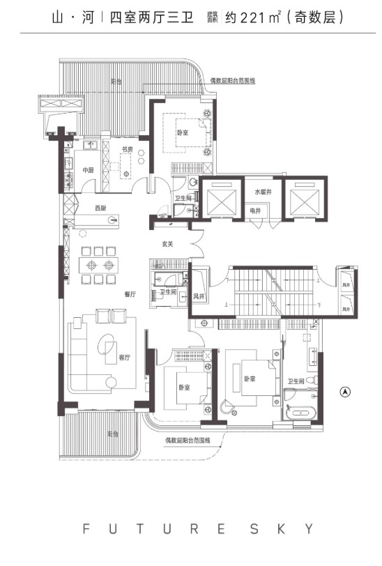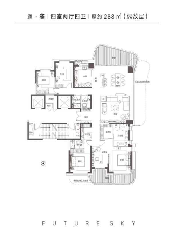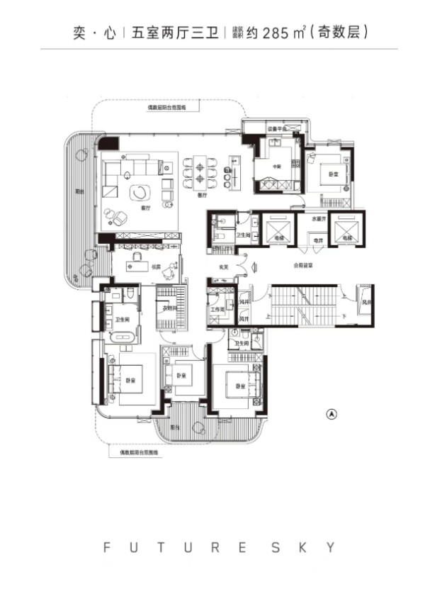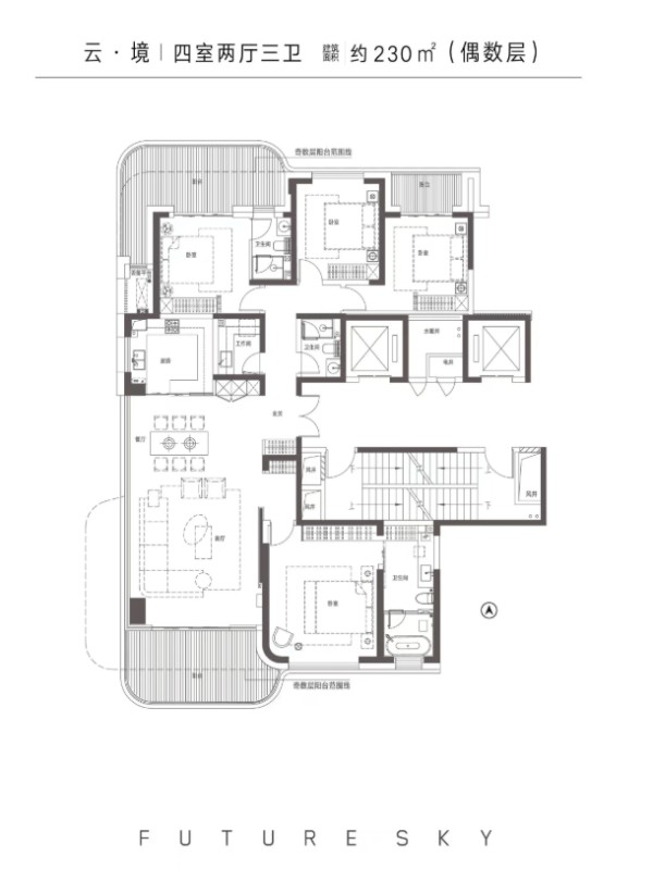 此户型是项目的巅峰孤品,以“空中垂直院落”的创新形态,打造上下双层的立体生活空间。一层为社交天地,二层为私密领域,融合百年芬迪经典美学。它超越了普通住宅的范畴,是为中原塔尖中的塔尖人物量身定制的、具有收藏价值的建筑艺术品,是顶层生活信仰的终极物质呈现。