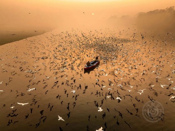 黎明初现时分,在恒河主要支流亚穆纳河的河岸阶梯旁,成群的西伯利亚海鸥以整齐划一的飞行姿态描绘出天际的画卷。每年十一月至次年三月,大批候鸟迁徙至此,吸引着摄影师与游客前来捕捉这和谐瞬间,并为飞鸟投喂食物。