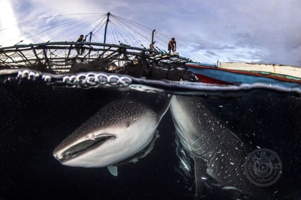 在婆罗洲东海岸的德拉万群岛附近,鲸鲨聚集在“巴干”周围——这是东南亚传统木制渔业平台,配有渔网。这张在黎明时分拍摄的照片捕捉到渔民收网的瞬间,画面中鲸鲨正吞食渔民丢弃入海的误捕鱼类。