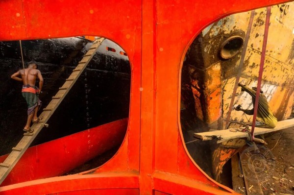一张拍摄于孟加拉国船厂的工作场景照片,画面中两名男子正忙于修船。饱经风霜的锈蚀船首与船体其他部分鲜艳的色彩形成鲜明对比,凸显出船厂生活中贯穿始终的辛劳与坚韧。