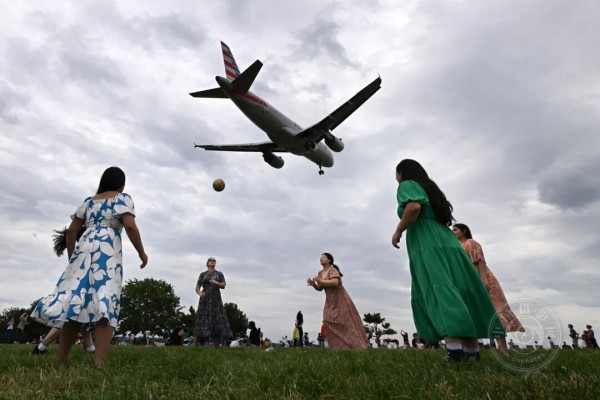 一架飞往罗纳德里根华盛顿国家机场的飞机,于2024年6月2日星期日飞越美国弗吉尼亚州阿灵顿市格雷维利角上空。此时,刚参加完礼拜的使徒与先知福音教会信徒们正在该处打排球。