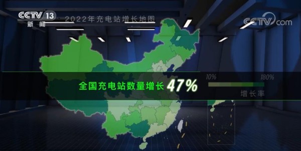 这是一幅2022年充电站的增长地图,颜色越深代表着增速越高。2022年12月和1月相比,全国充电站数量总体增长了近五成。