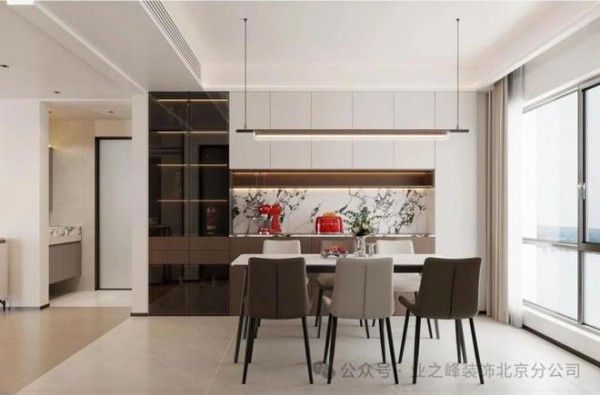 在核心公共区域,北京业之峰的设计巧思随处可见。客厅以暖棕与纯净白为主基调,线条利落却不失温润,大面积嵌入式柜体将生活琐碎高效收纳,局部深色开放格与竖向装饰槽的点缀,让空间层次更显细腻。金属圆环吊灯与皮质沙发的搭配,更添一丝低调轻奢韵味,成为亲友相聚的温馨主场。餐厅区域则融入黑玻璃材质与天然大理石纹理,在白棕主调中形成丰富质感对比,嵌入式柜体搭配内嵌灯带,既满足收纳需求,又营造出柔和温馨的用餐氛围,红色家电的点缀更注入鲜活生活气息。