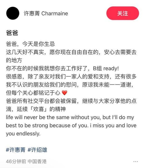 爸爸所有社交平台都会被保留,继续与大家分享他的点滴,延续「欢喜」的精神 life will never be the same without you, but I’ll do my best to be strong because of you. i miss you and love you endlessly.