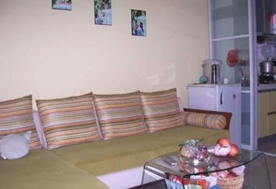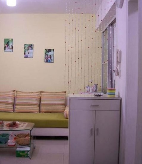 墙体颜色主要为白色,同时沙发的背景墙上为淡淡的黄色,同时,沙发前方摆放着玻璃茶几。进门的右手边是一个柜子,为起到玄关的作用,在柜子后面添加一个垂帘,起到隔开空间的效果。