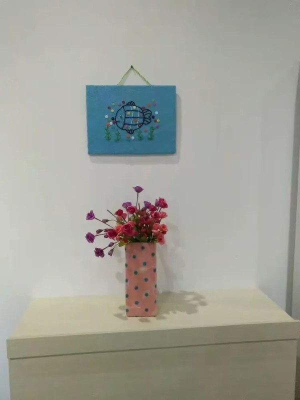 这幅蓝色背景的手工刺绣画作,如今挂在了博物馆的展厅里,成为了展品中的一员。画面中央的小鱼仿佛在诉说着我的故事,而下方展示台上摆放的粉色波点花瓶插满紫色花朵,为整个空间增添了一抹温馨的气息