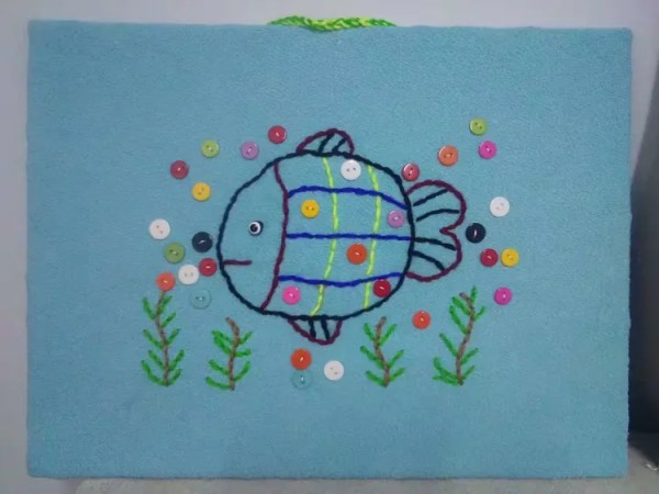 经过一番努力,我的手工刺绣终于完成了。彩色纽扣拼贴成的小鱼图案似乎是只寻水的鱼,周围点缀着绿色植物形状的设计元素,在蓝色底布的映衬下显得格外生动可爱。这不仅仅是一幅画,更是我用心创造的艺术品