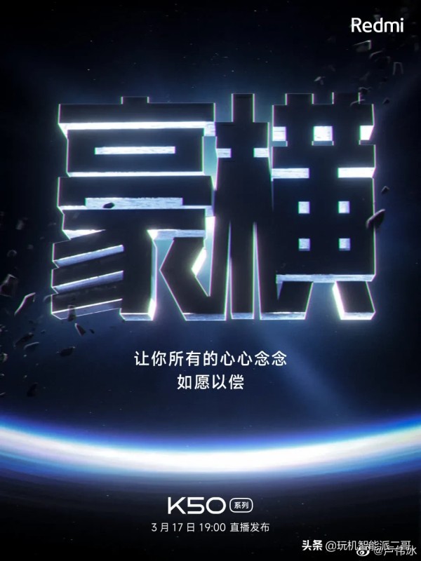 即将在3月17日发布的新机#Redmi K50# 系列。卢伟冰憋足了大招,有意要将K50系列带上行业巅峰。120W超级闪充4700毫安电池,后置一亿像素主摄前置3200万像素美颜相机。天玑8100旗舰处理器,全新纳米微晶工艺机身。不管是外表还是内在红米K50系列这次都是逼格满满,但是没有人会想到它只要1999元起。
