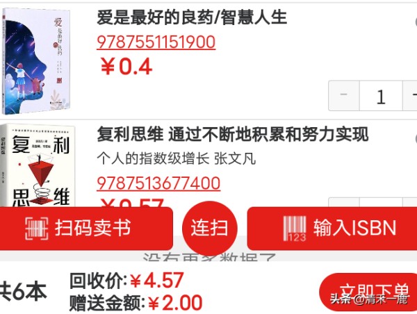 这种回收旧书的平台倒不如打着让图书循环利用的名头,上门收取得了,不用给这四五毛,这四五毛钱让我这种时常买书也算爱书的人看着真闹心啊,有种知识被践踏侮辱的感觉,什么知识都不止值这四五毛钱了吧,一本书纸张都不止四五毛了。