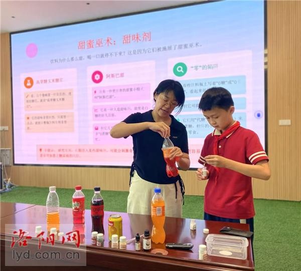 滴入2滴柠檬黄色素,原本透明的清水立刻变成了橙黄色;再加入糖浆和柠檬酸,就有了酸酸甜甜的味道;最后放入增稠剂,脆爽的果肉纤维出现了……17日下午,在洛阳市双语实验学校活动室里,洛阳市消费者权益保护中心公益讲师杨柳柳用一场生动的实验课,为孩子们揭开“饮料里的小秘密”。