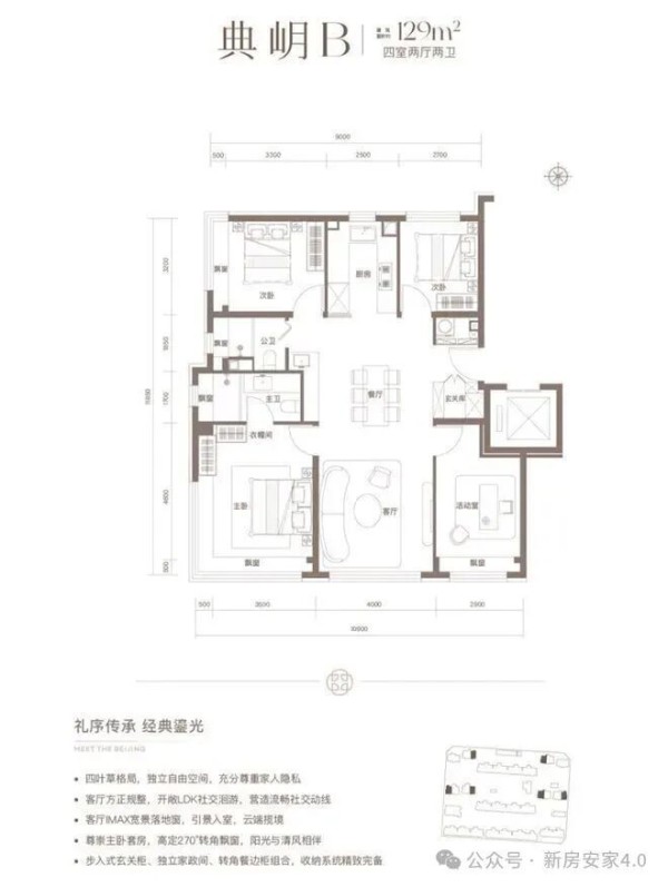 约129平米四居,主卧与北向一间次卧均做到了270度采光,边飘窗的优势在这里不赘述。