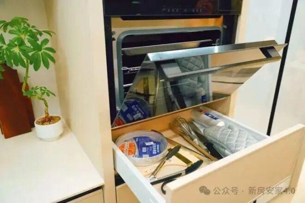 海岄也做许多更贴近当下生活的细节处理。比如,蒸烤箱的位置比较靠上,会更方便操作,蒸烤箱下方有收纳烘焙工具的储物空间,可以摆放蒸烤所用的佐料、物品等。再比如,厨房增加了透气收纳篮,用于放置水果蔬菜。