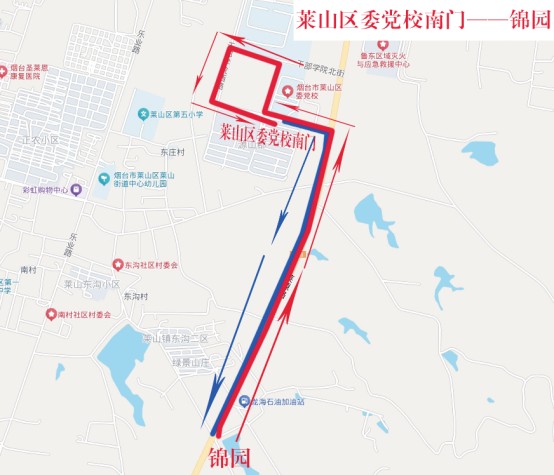 由莱山区委党校发车,沿干部学院街、莱源路运行至锦园,调头返回莱山区委党校。