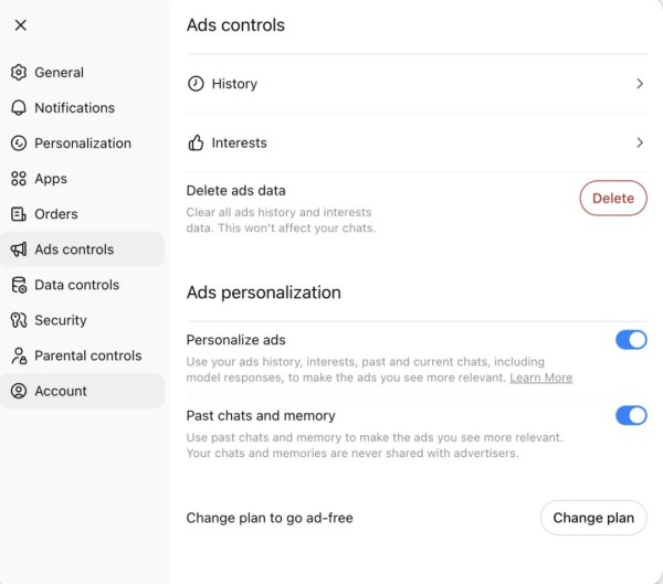 第三条,透明且可控。用户能清楚知道自己的数据如何被用于匹配广告,还能自主控制——比如关闭广告个性化设置、关闭基于历史对话的广告推荐,甚至可以删除广告相关的数据,不想看的广告类型,能自主规避。