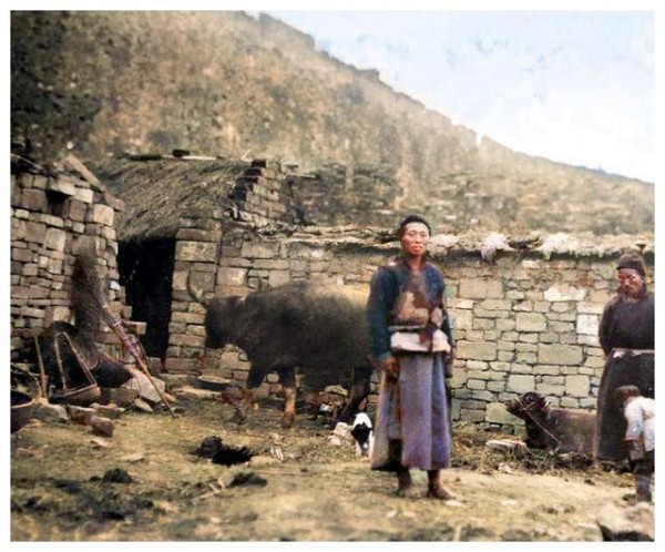 照片中,一位爷爷带着孙子站在简陋的牲口棚前,身后是两头水牛,一大一小。地上散落着牛粪,空气中弥漫着农村的气息。旁边有一只黑白相间的小狗正在觅食。这种场景可能让现代人难以想象,但它确实是上海一百多年前的真实写照。