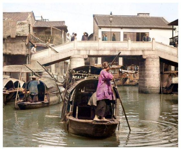 苏州河上还有一幅充满生动气息的画面:一位年轻女子站在船尾,手持船篙,熟练地撑船前行。她的身后是一座横跨河道的石桥,桥面上装有一盏西式路灯,给这幅古老的画面增添了一些异国情调。