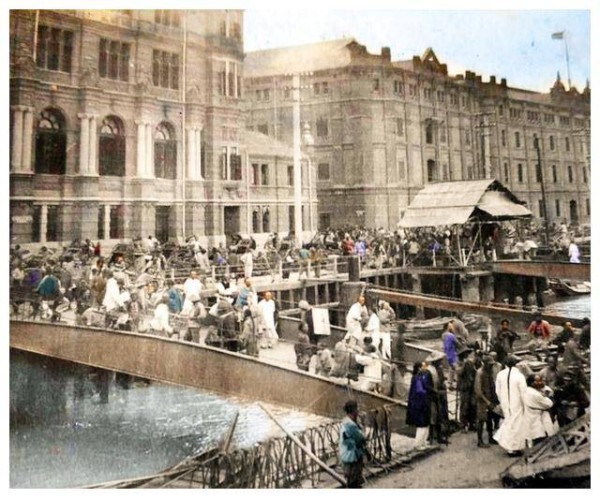 与外滩的繁华不同,苏州河上同样呈现出一幅忙碌的景象。河道上架设了两座铁桥,工人们正在忙碌地搬运货物,行人也在河边穿梭,场面显得异常拥挤。河面上的船只不停往返,显现出当时上海的商业活力。