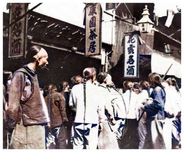 在一家酒庄的促销活动现场,围满了众多男子,现场异常拥挤,显然促销活动吸引了大量顾客。这些男子大多数都有着浓密的辫子,油光可鉴,场面一度让人感受到上海当时热闹的商业氛围。